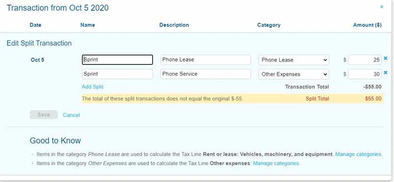 If you have an expense that involves more than one category, you can split the expense. A common example would be your cell phone, where you might have the lease payment for the phone and your data service.