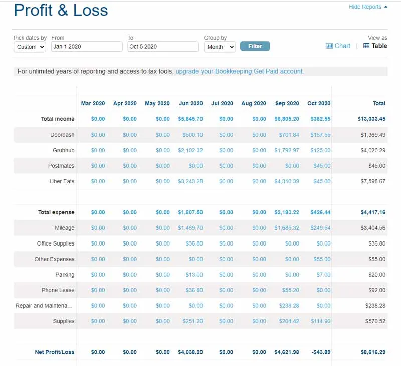 GoDaddy BookKeeping can show you charts or a table view. While the charts provide a nice glance at how you’re doing, I tend to prefer the detail of the table view.